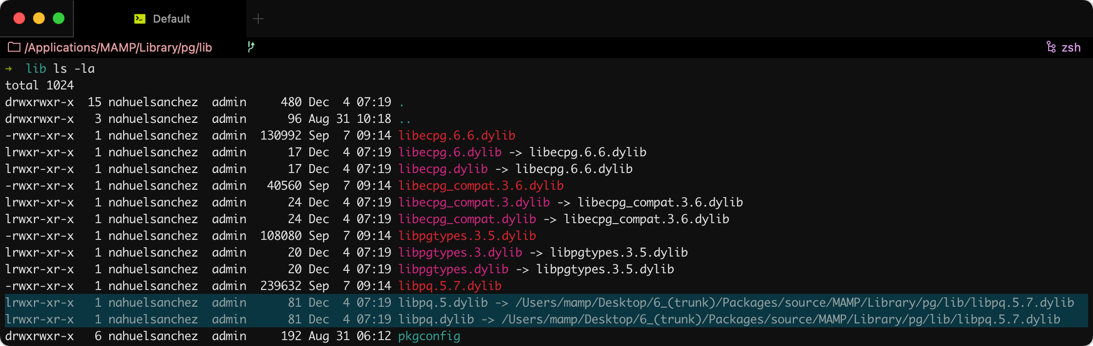 That's not all. Go to /Applications/MAMP/Library/pg/lib and you'll notice something really weird which are broken paths for the symlinks libpq.5.dylib and libpq.dylib as seen below.