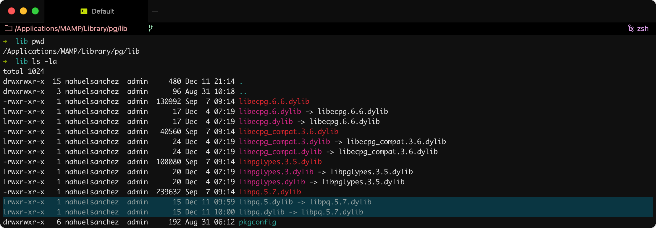 As you can see on the previous screenshot, the symlink libpq.5.dylib points to a broken path for libpq.5.7.dylib which is basically right there on the same folder. The same goes for libpq.dylib.