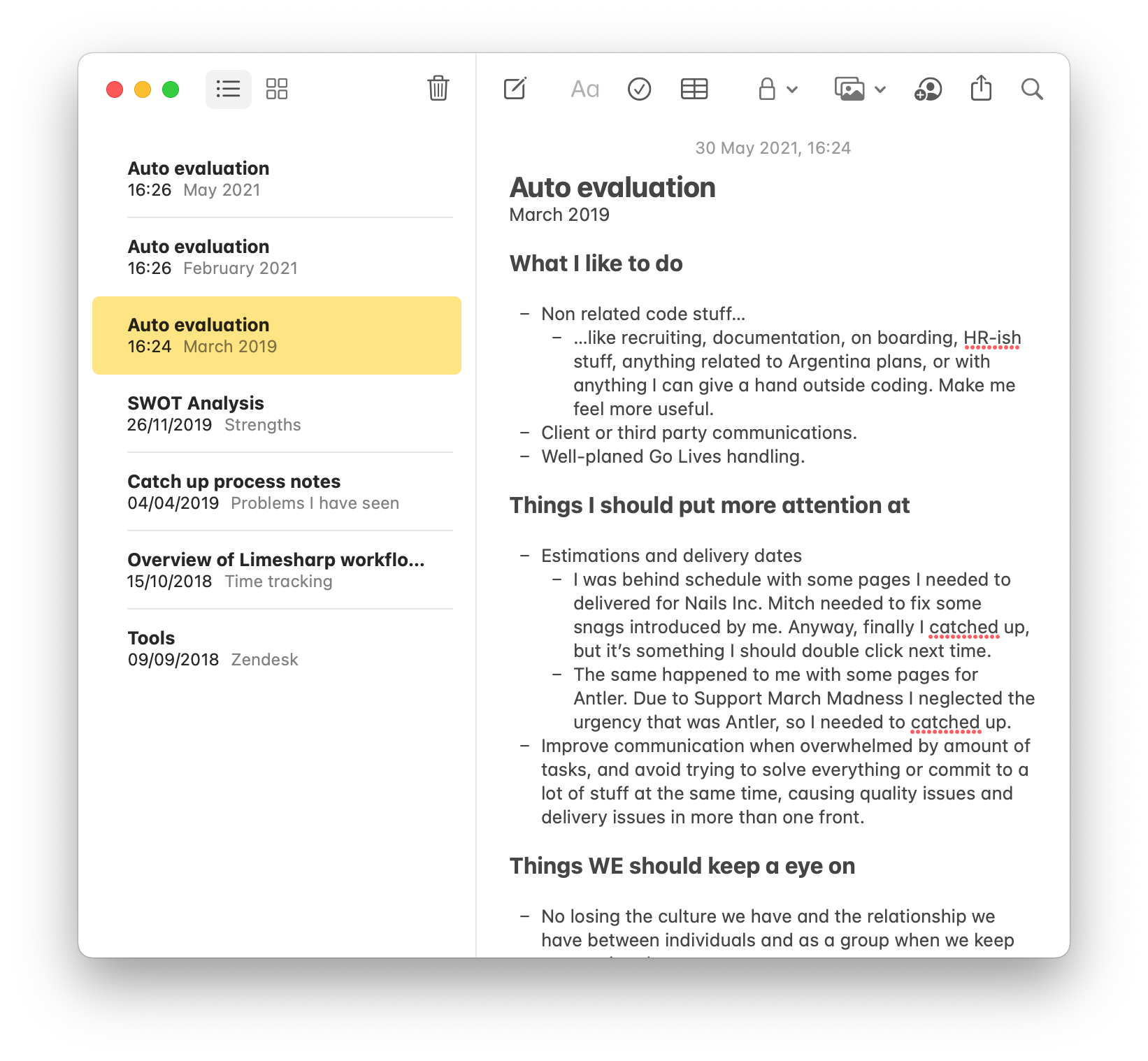 Up there you can see a real self-evaluation I did on March 2019 before a performance review I had, and two more on the sidebar.