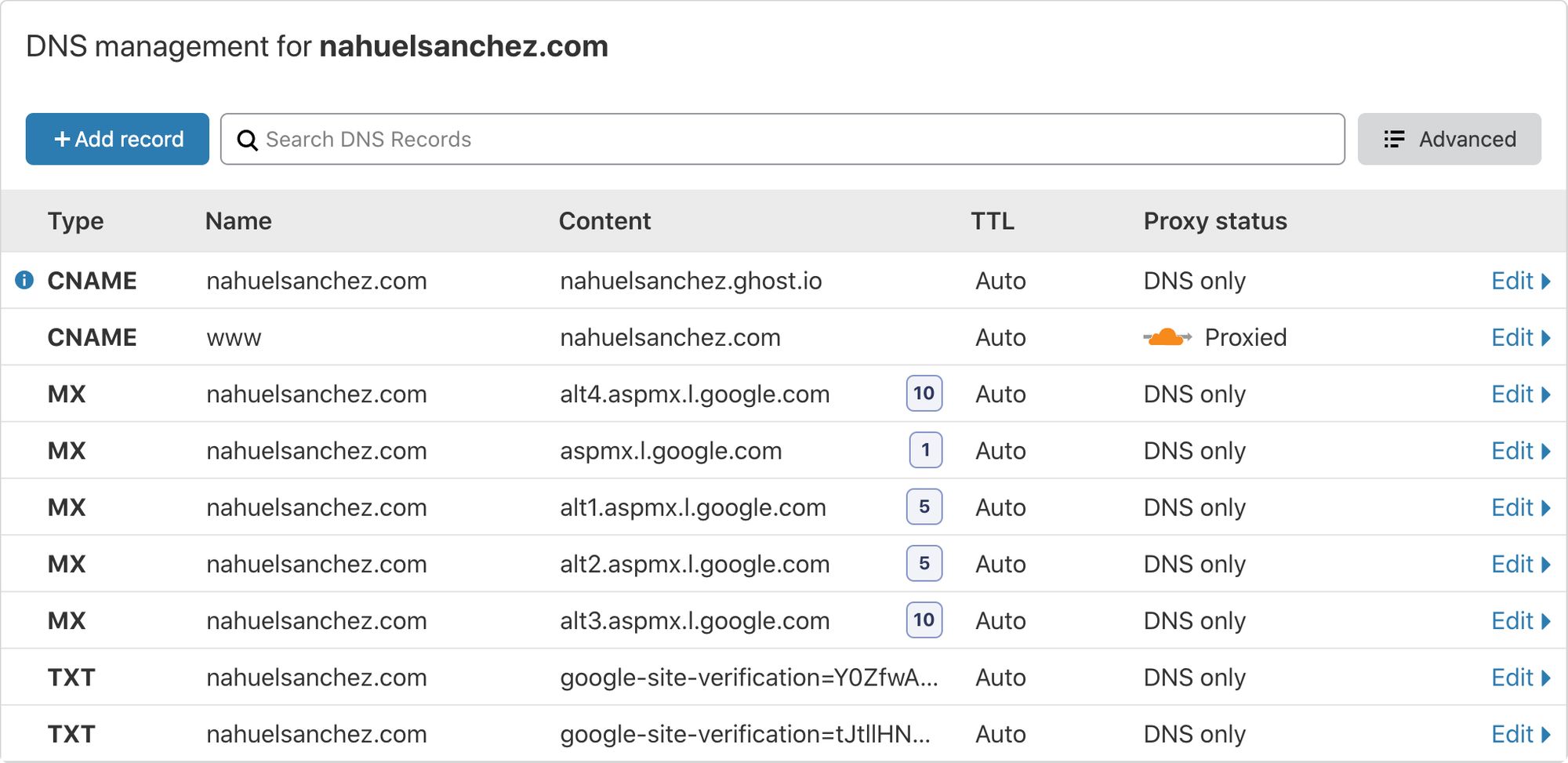 The first two rows are the one that matter for this tutorial, and the others are used to make Google G Suite works (so I can have my email hosted by Google).