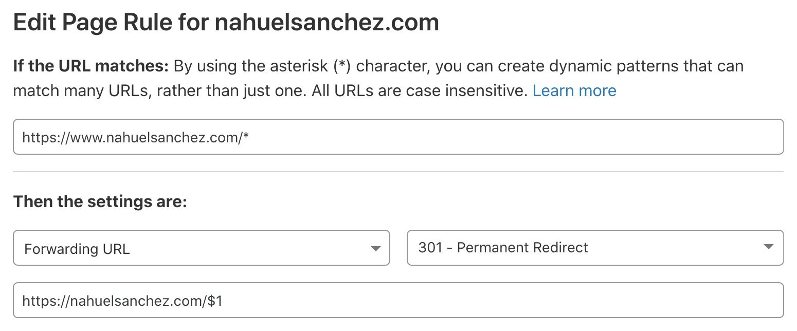 Note that my decision was to have the non-www version of my domain as the default one because I just like it that way. If you prefer the other way around, then invert the CNAME configuration on the previous step and configure the following page rules inverted too.